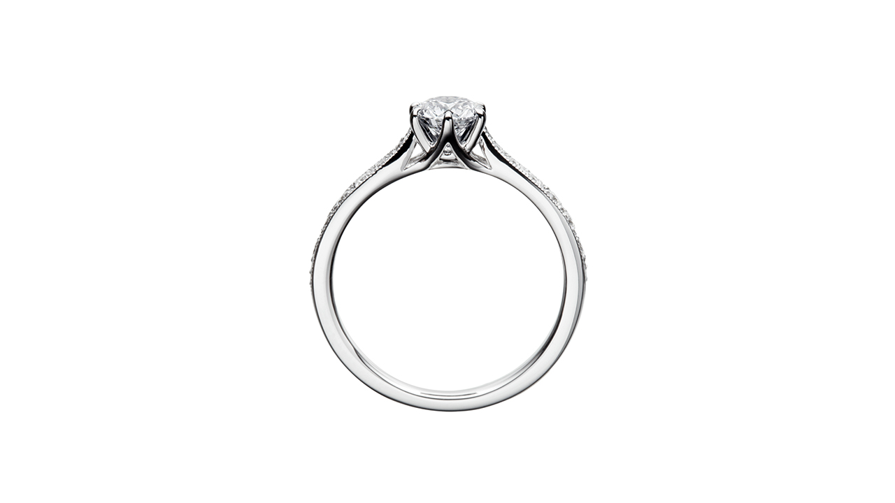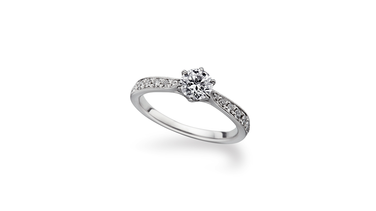 主役のダイヤモンドの左右にそっと添えられた小粒のダイヤモンド。 繊細に配された煌きのアクセントは、まるでセンターのダイヤモンドから輝きが溢れたかのよう。