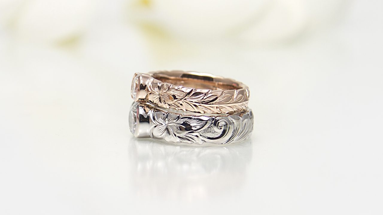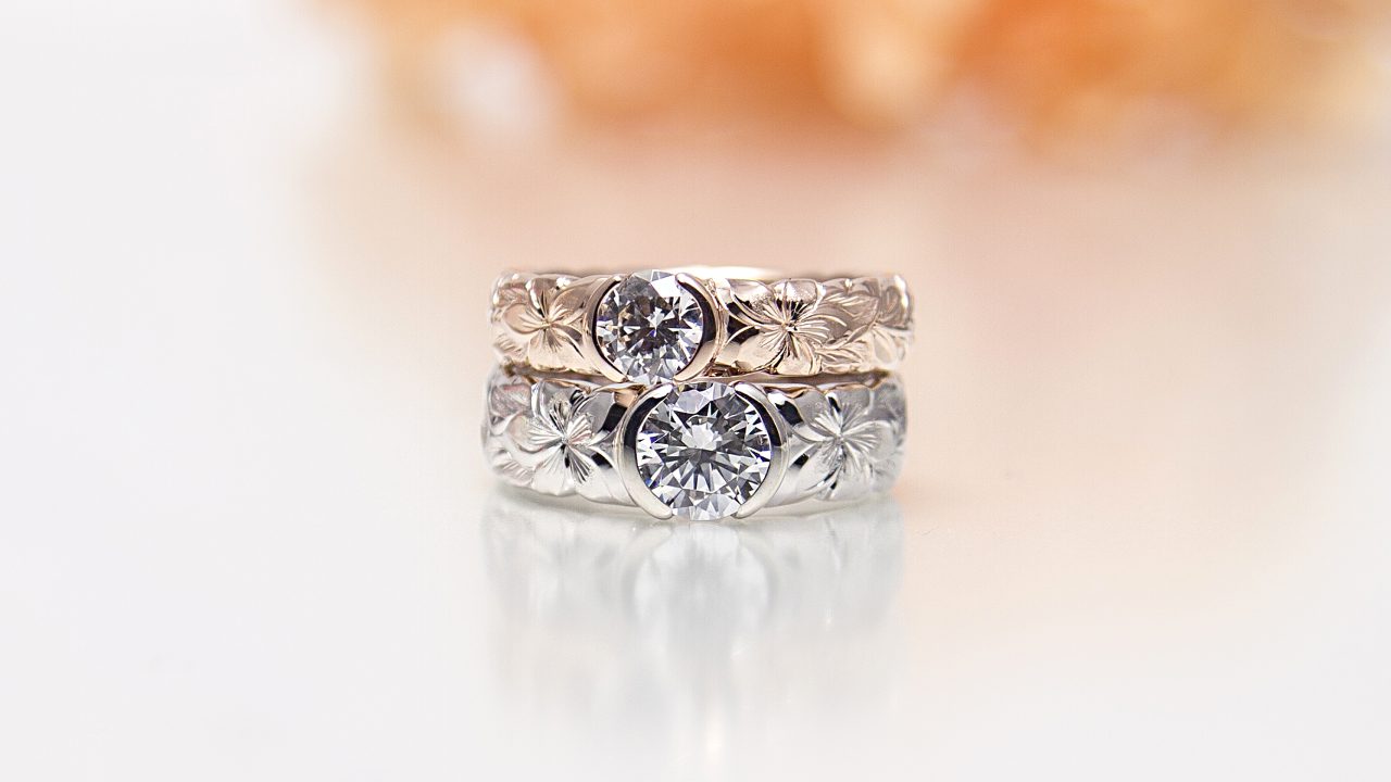 手彫りの美しいハワイアンエンゲージリング(婚約指輪)をご用意いたしました。手彫りの美しい婚約指輪をご用意いたしました。ダイヤモンドの美しさと、手彫りにより刻み込まれたハワイアンモチーフがキラキラと輝き、どこから見ても美しい指輪になっております。