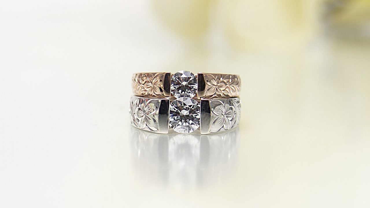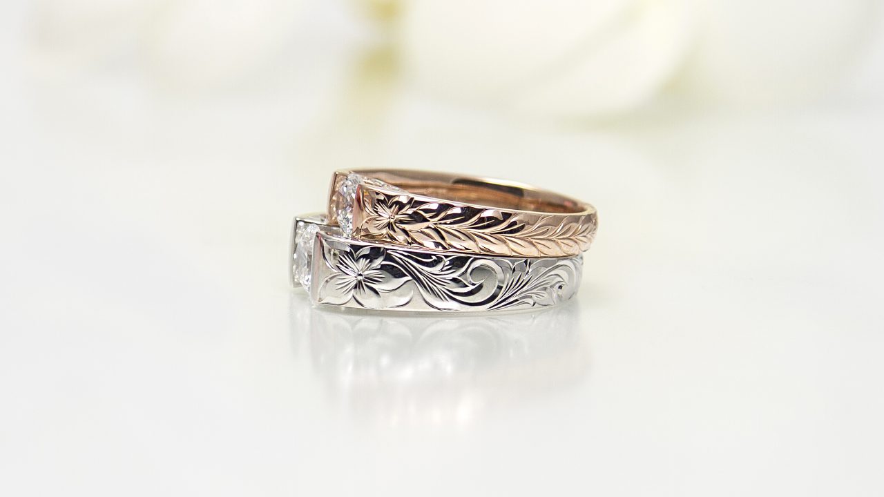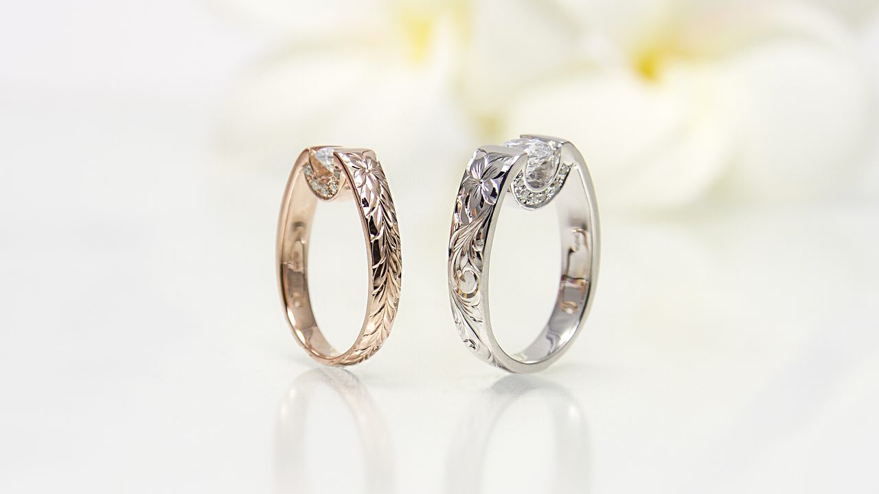 手彫りの美しいハワイアンエンゲージリング(婚約指輪)をご用意いたしました。手彫りの美しい婚約指輪をご用意いたしました。