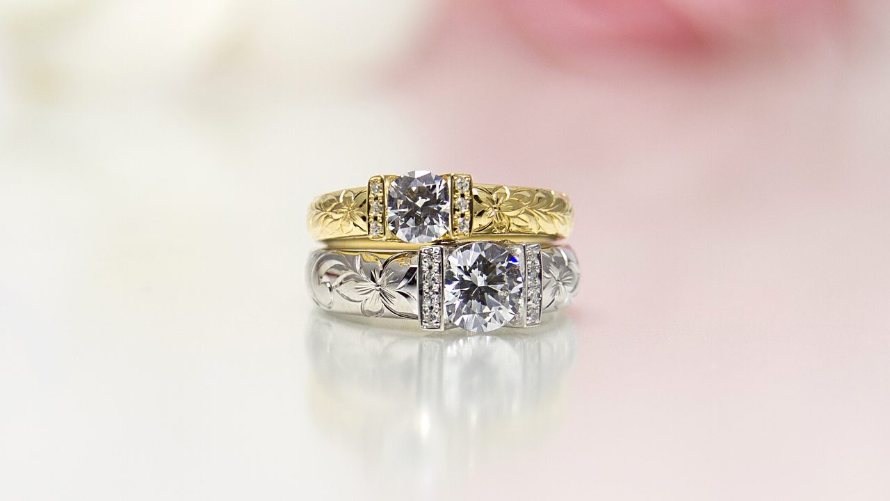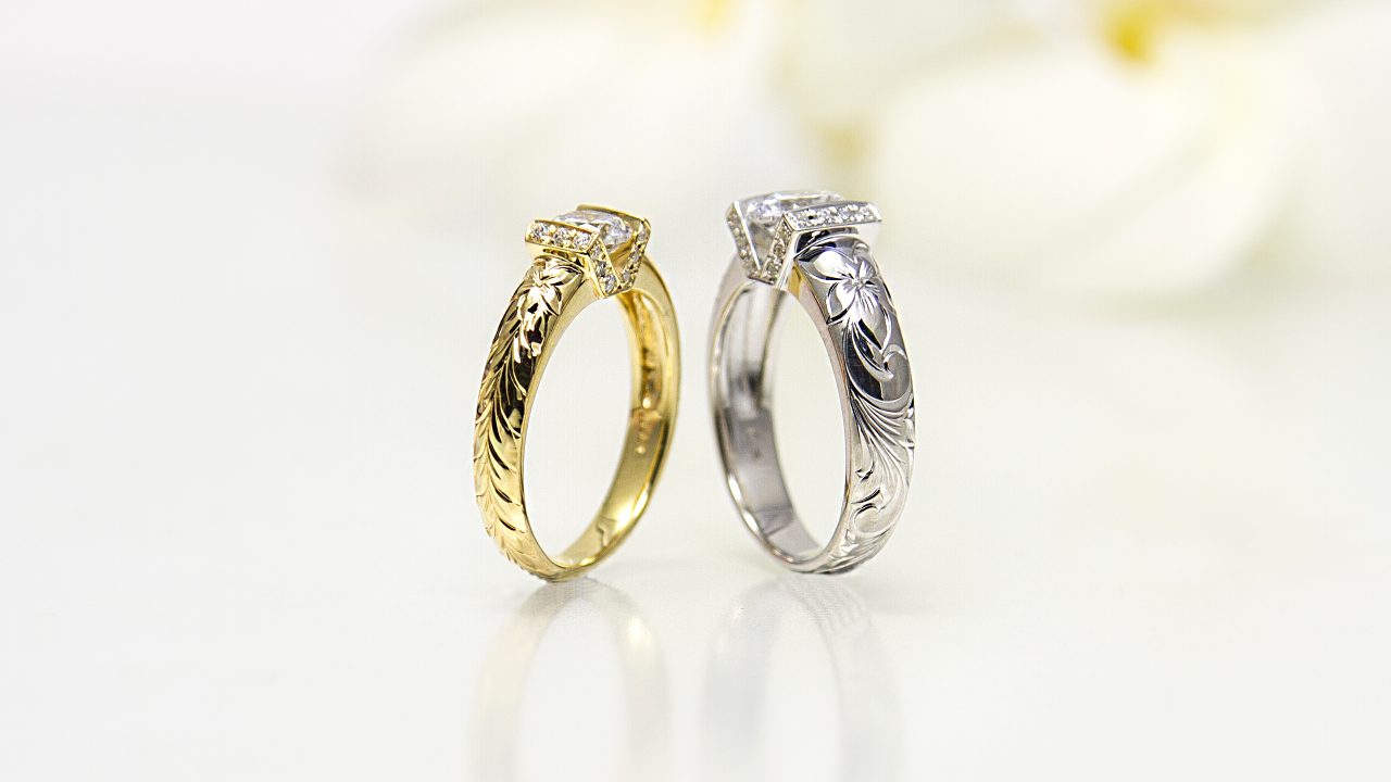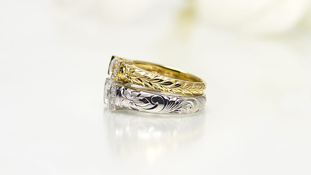 手彫りの美しいハワイアンエンゲージリング(婚約指輪)をご用意いたしました。手彫りの美しい婚約指輪をご用意いたしました。