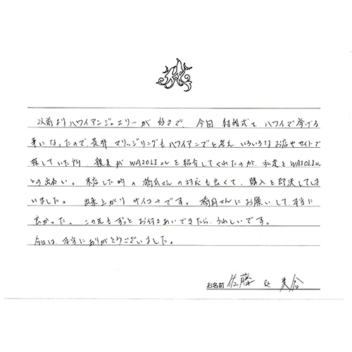 以前よりハワイアンジュエリーが好きで、今回結婚式をハワイで挙げる事になったので是非マリッジリングもハワイアンでと考え、いろいろなお店やサイトで探していた所、親友がWAIOLIさんを紹介してくれたのが、私達とWAIOLIさんとの出会い。 来店した時の橋爪さんの対応も良くて、購入を即決してしまいました。出来上がりサイコーです。橋爪さんにお願いして本当に良かった。この先もずっとお付きあいできたらうれしいです。今日は本当にありがとうございました。
