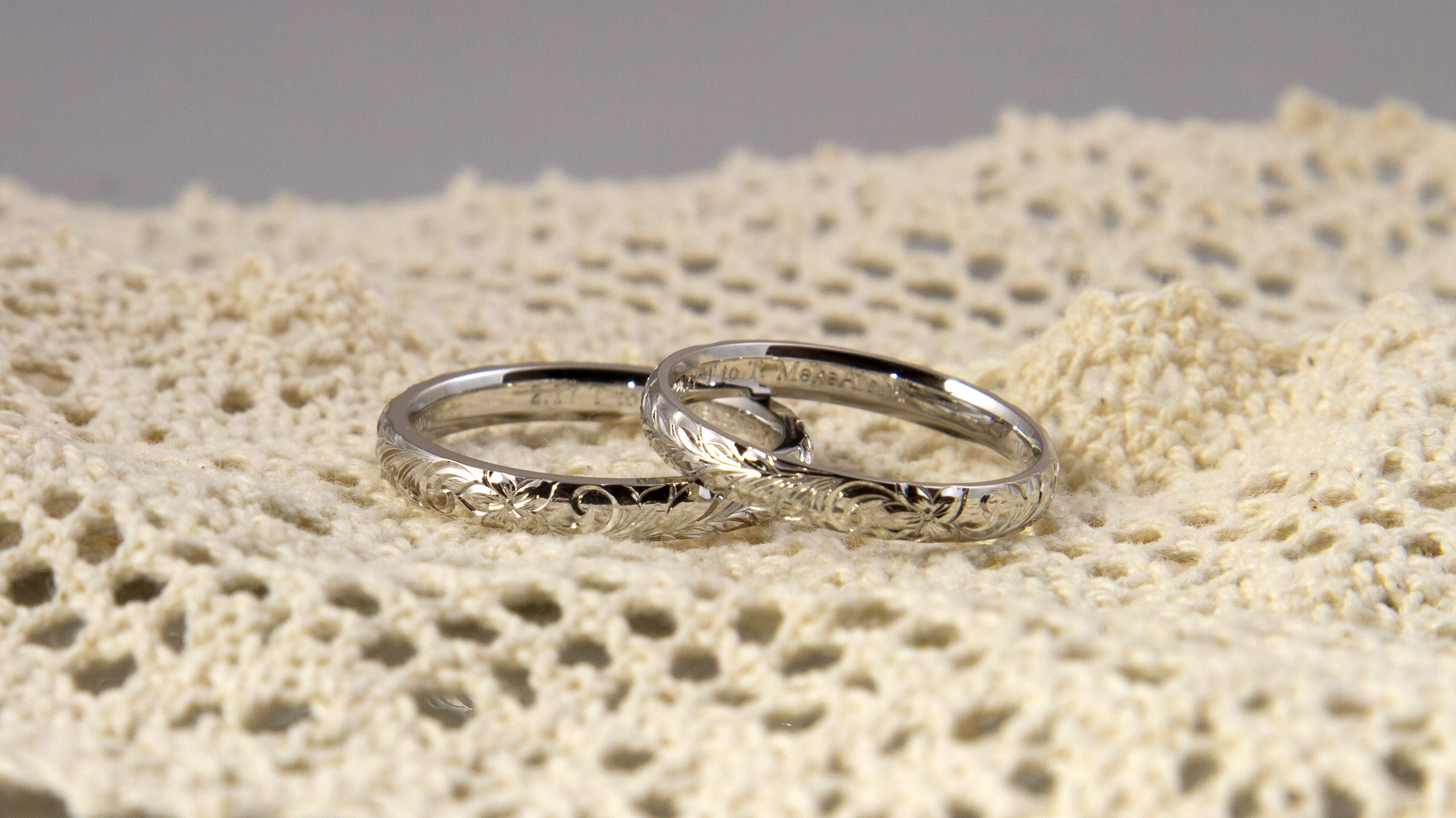 切れ目(繋ぎ目)がなく、通常の指輪と比べ2~3倍の強度になる【鍛造製法】で制作した指輪に、ハイビスカスとスクロールマイレを手彫りしました。10号の指輪を制作するにあたり、15号の指輪を制作し、圧を掛け10号まで縮める為、金属がとても引き締まっており強度が高くなります。また、手彫りは引き締まった金属の方がより美しく施すことが出来る為、指輪制作にもこだわり制作させて頂きました。
