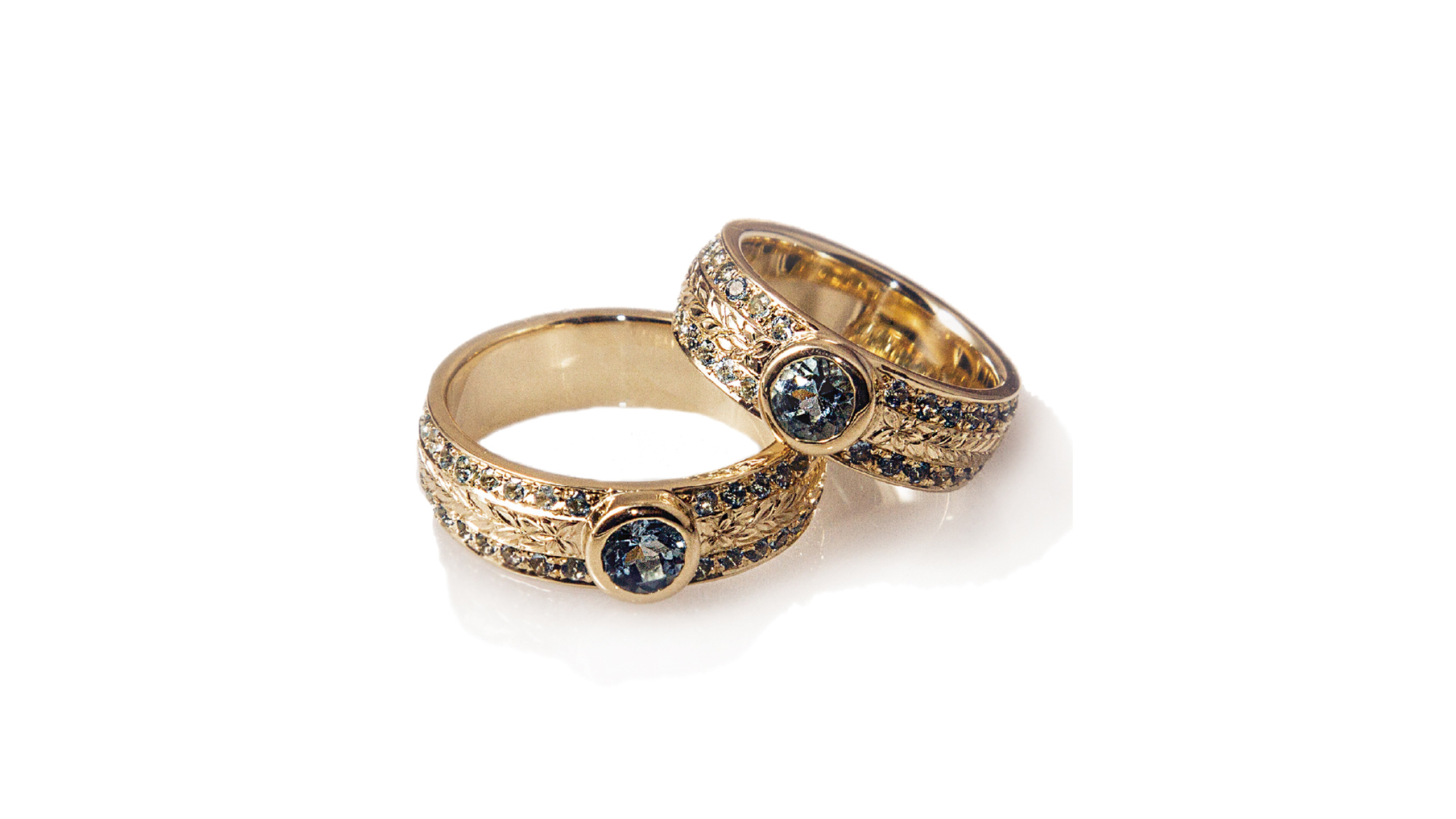 お二人の誕生石のアクアマリンを贅沢に使用し、制作させて頂きました。センターには5mmのアクアマリンをセッティング。1.5mmのアクアマリンを両サイドにフルエタニティセッティングしました。石と石の間には、ハイビスカスとシャイニーマイレモチーフを施しました。こだわり貫いた特別なご結婚指輪が完成し、とてもお喜び頂けました。