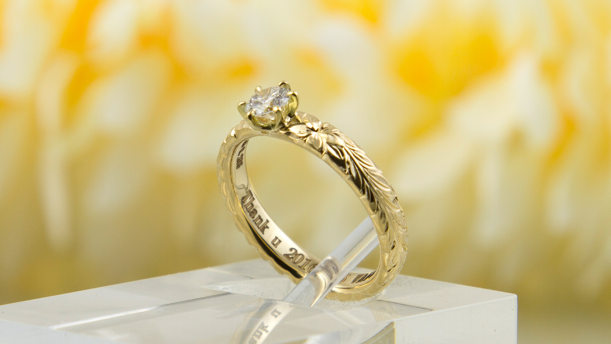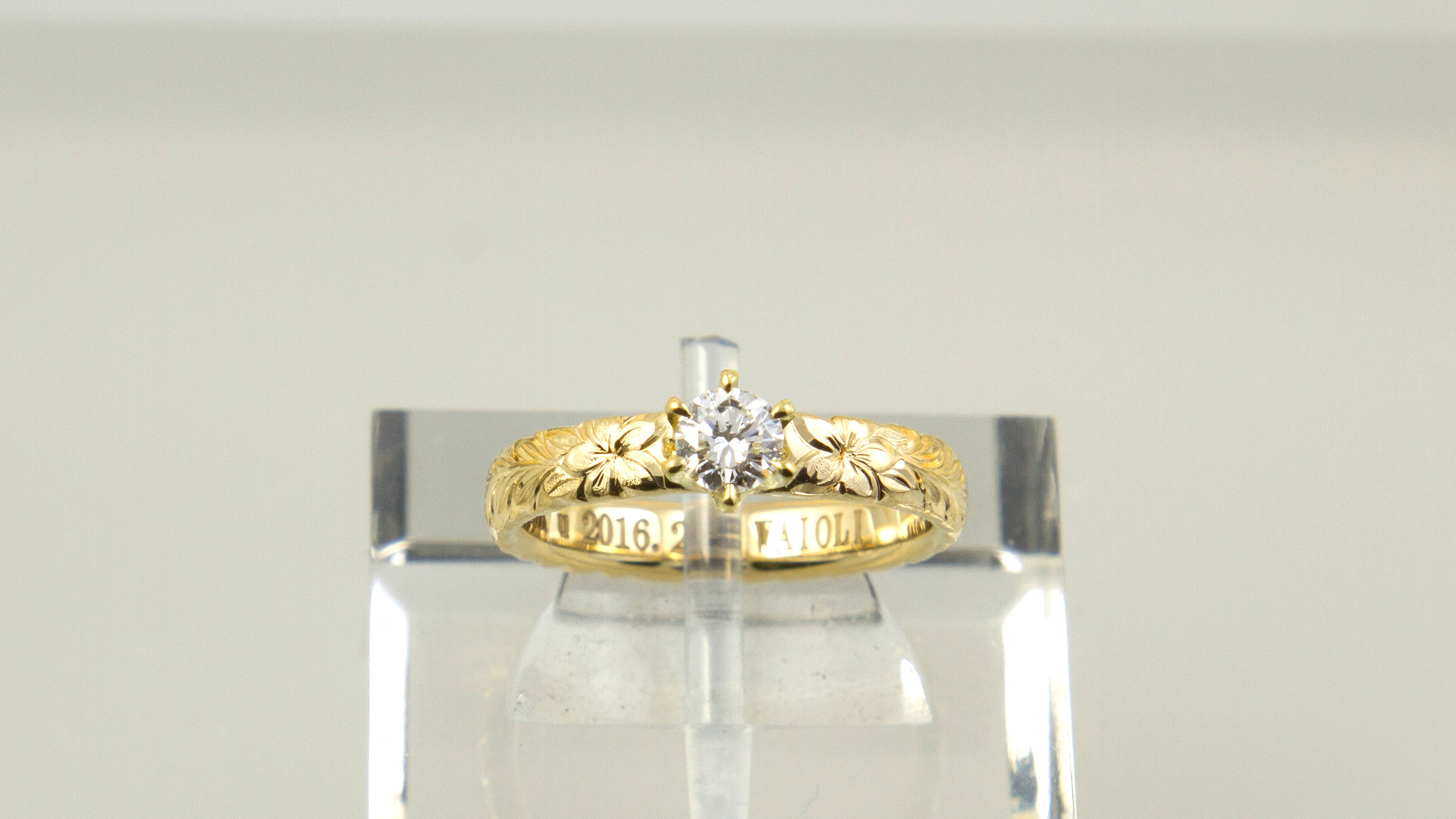 0.2ctのダイヤモンドをセンターにセッティングした婚約指輪です。 ダイヤモンドの両サイドにはプルメリアを施し、ディープカットのマイレ(葉)模様を繋げました。 完成した指輪をご覧頂き、想像以上の仕上がりで大満足です。と喜び頂きました。
