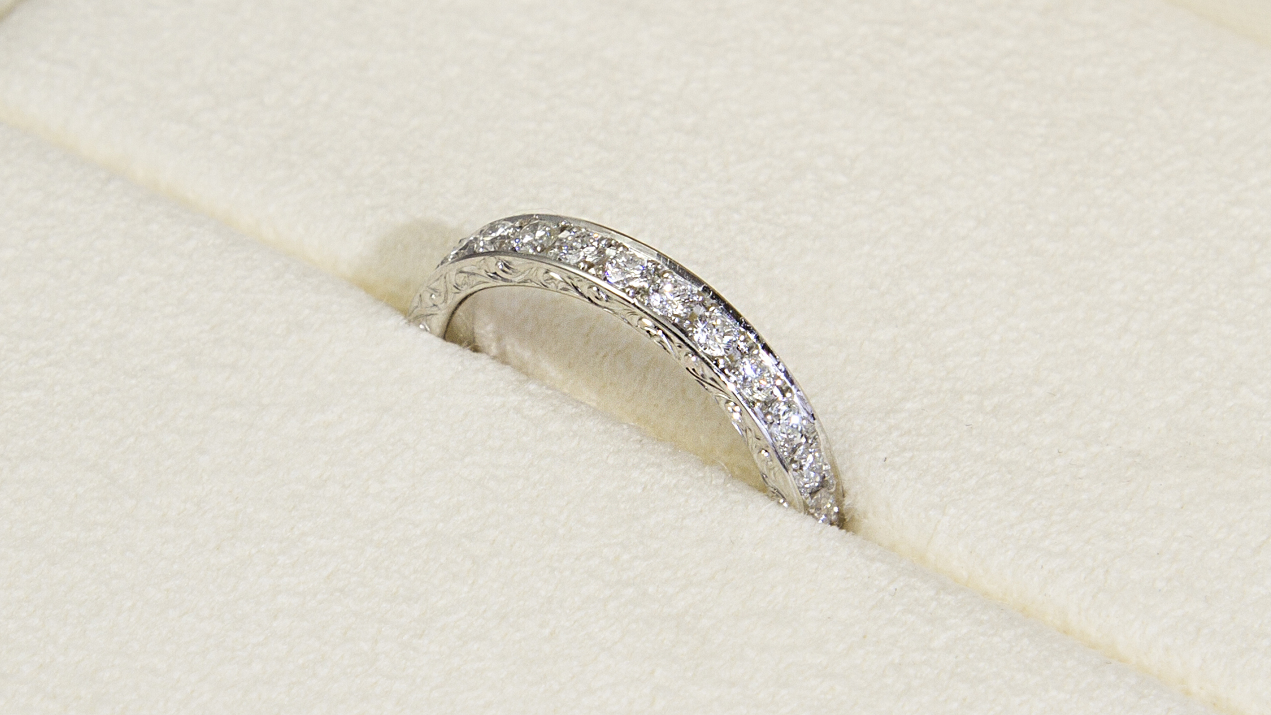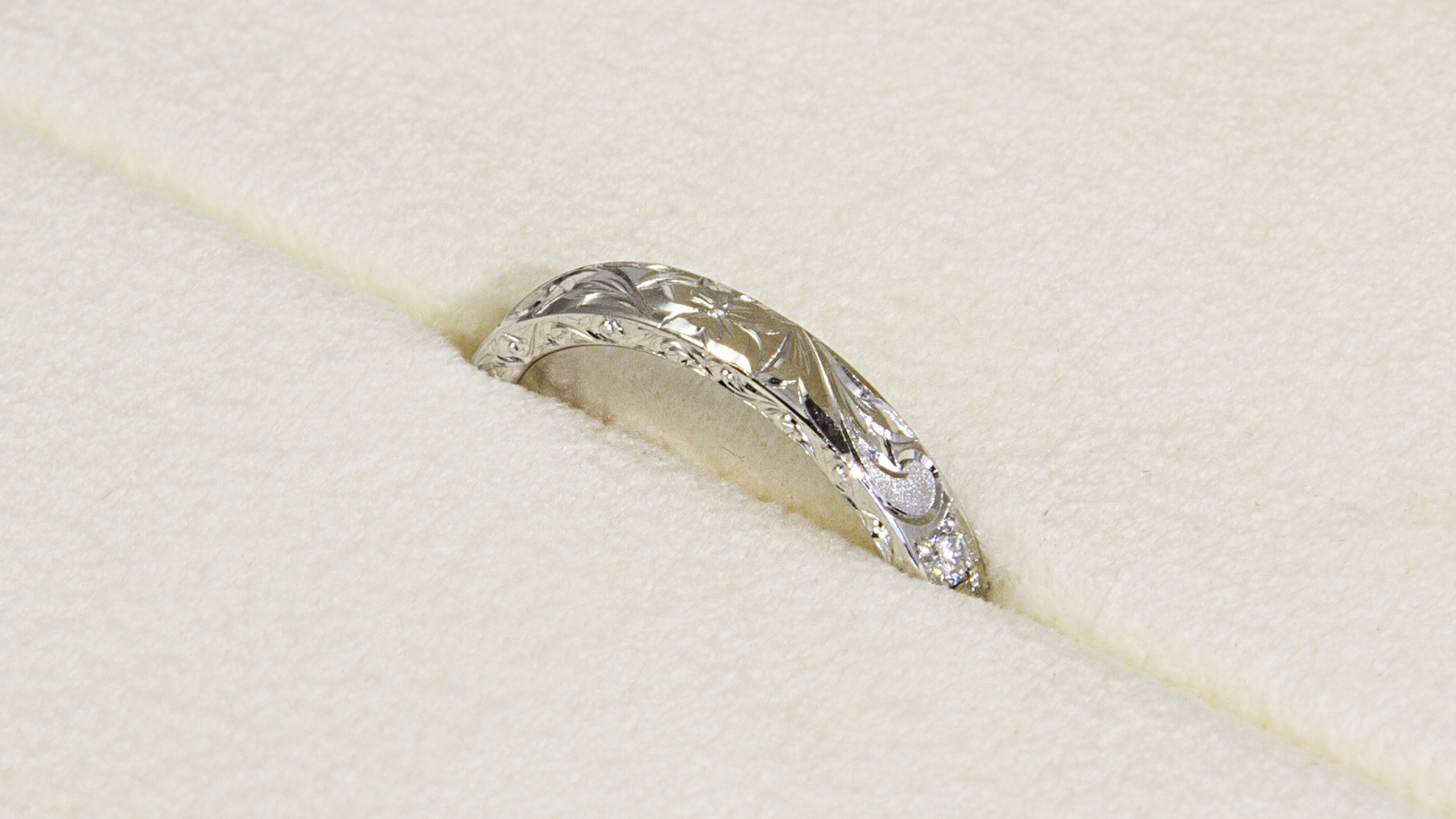石川様、この度はWAIOLIにオーダー下さいまして誠にありがとうございました。 指輪の3分の2に2mmのダイヤモンドをセッティングし、3分の1にハイビスカスとスクロール&リーフを手彫りしました。クオリティの高いダイヤモンドを使用した為、とても綺麗に輝く素敵な指輪になりました。 指輪の側面には、スクロールモチーフを手彫りで施しました。側面に模様を施す事で指輪全体が締まり、高級感がアップします。 お気に召して頂けて本当に嬉しいです。メンテナンス等いつでもお気軽にお越しください。またお目に掛かれる日を楽しみにしております。