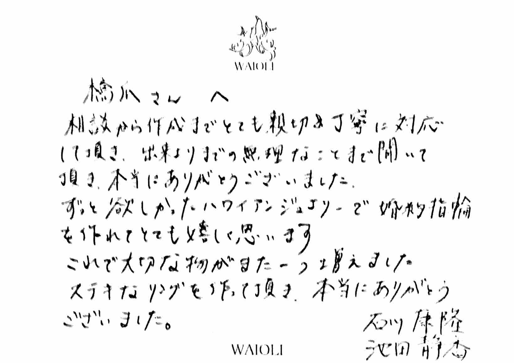 相談から作成までとても親切&丁寧に対応して頂き、出来上がりまでの無理なことまで聞いて頂き、本当にありがとうございました。ずっと欲しかったハワイアンジュエリーで婚約指輪を作れてとても嬉しく思います。これで大切なものがまた一つ増えました。ステキなリングを作って頂き、本当にありがとうございました。