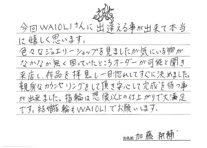 今回で2度目のオーダーだったのでスムーズで安心に指輪を手にする事が出来ました。そして想像以上の仕上がりで、またしても嬉しい気持ちになりました。何かの記念にまたふらっと訪れてみようと思います。
