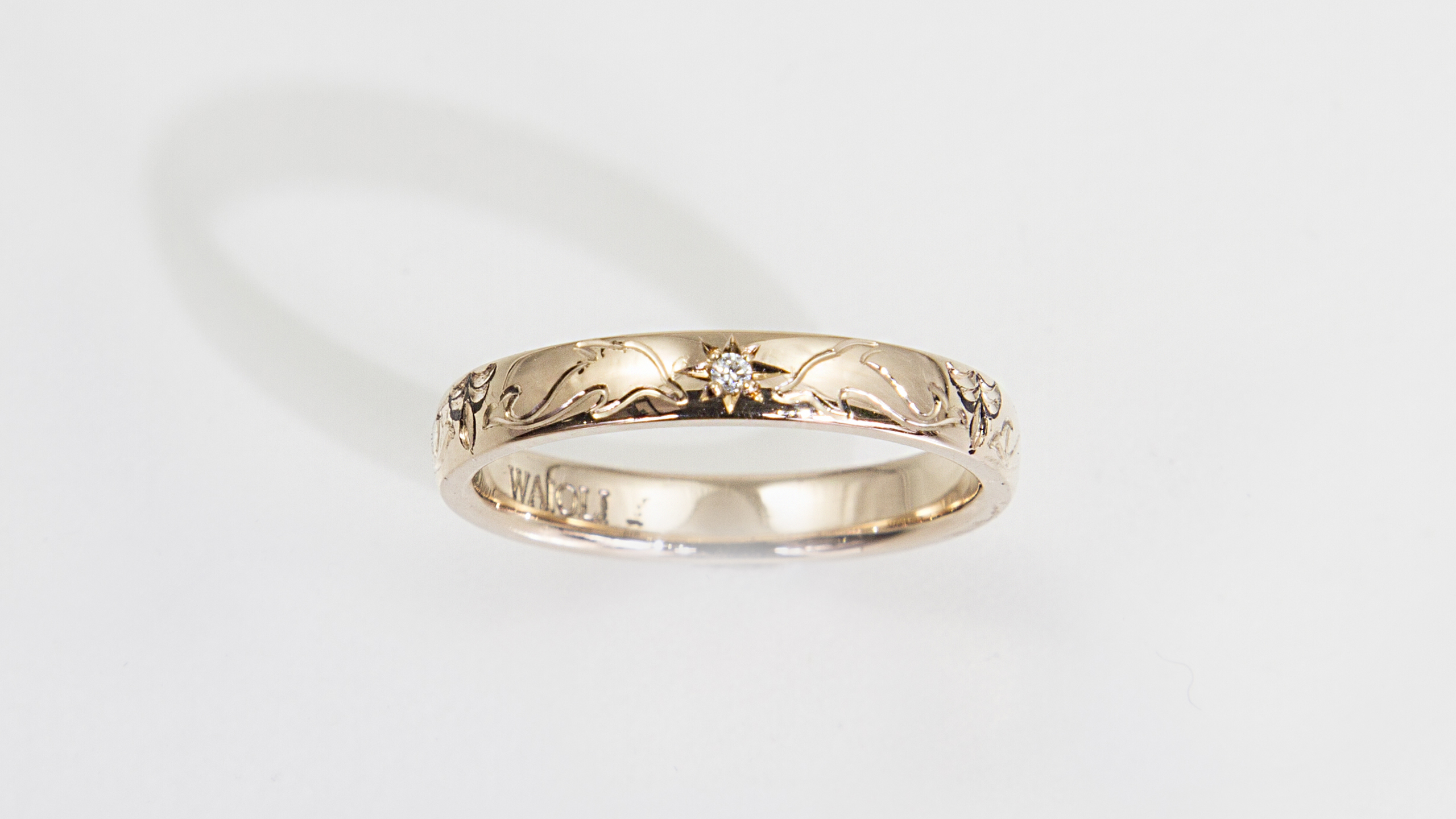 石井様、この度はWAIOLIにオーダー頂き、誠にありがとうございました。 ダイヤモンドを3石120度間隔でセッティングし、そのダイヤモンドを挟むように、イルカを向き合わせ手彫りしました。 イルカとイルカの間に少し隙間が出来てしまう為、パルメットというナツメヤシをイメージしたモチーフで飾りました。今までにないデザインでしたのでお渡しまで少し不安でしたが、とてもお喜び頂けて安心しました。 メンテナンス等いつでもお気軽にお越しください。またお目に掛かれる日を楽しみにしております。
