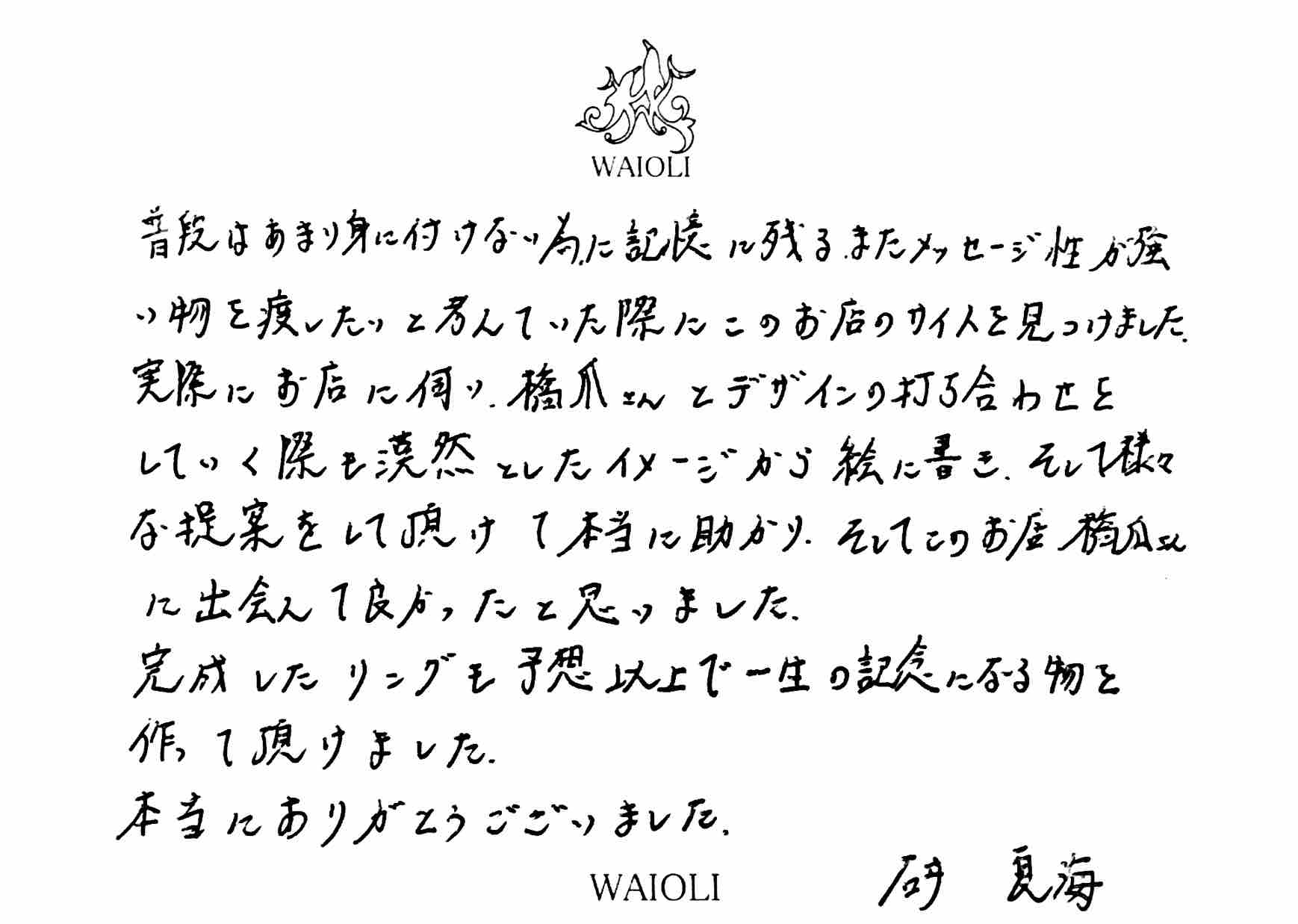 普段はあまり身に付けない為に記憶に残る、またメッセージ性が強い物を渡したいと考えていた際にこのお店のサイトを見つけました。実際にお店に伺い、橋爪さんとデザインの打ち合わせをしていく際も漠然としたイメージから絵に描き、そして様々な提案をして頂けて本当に助かり、そしてこのお店、橋爪さんに出会えて良かったと思いました。完成したリングも予想以上で一生の記念になる物を作って頂けました。本当にありがとうございました。