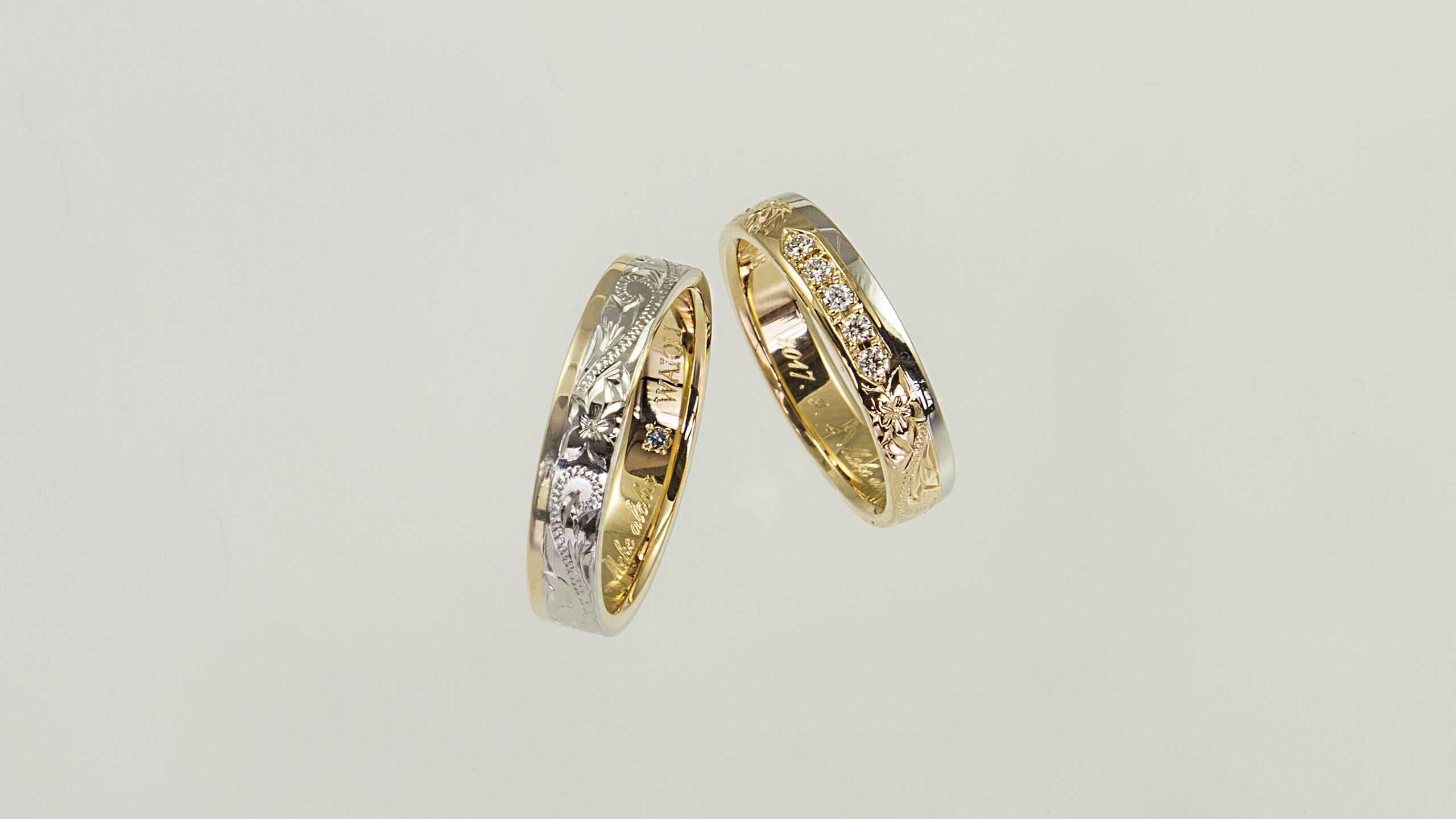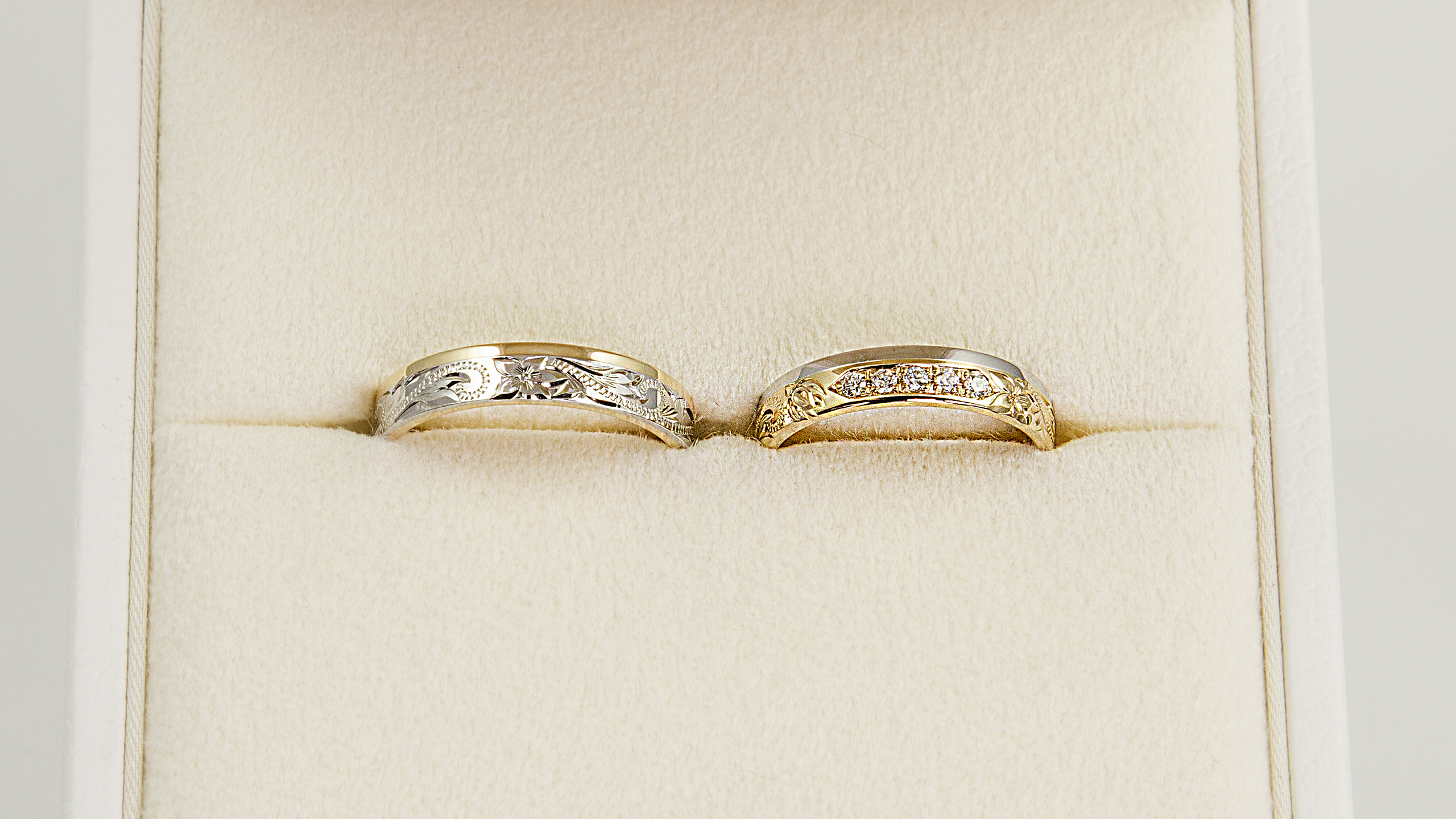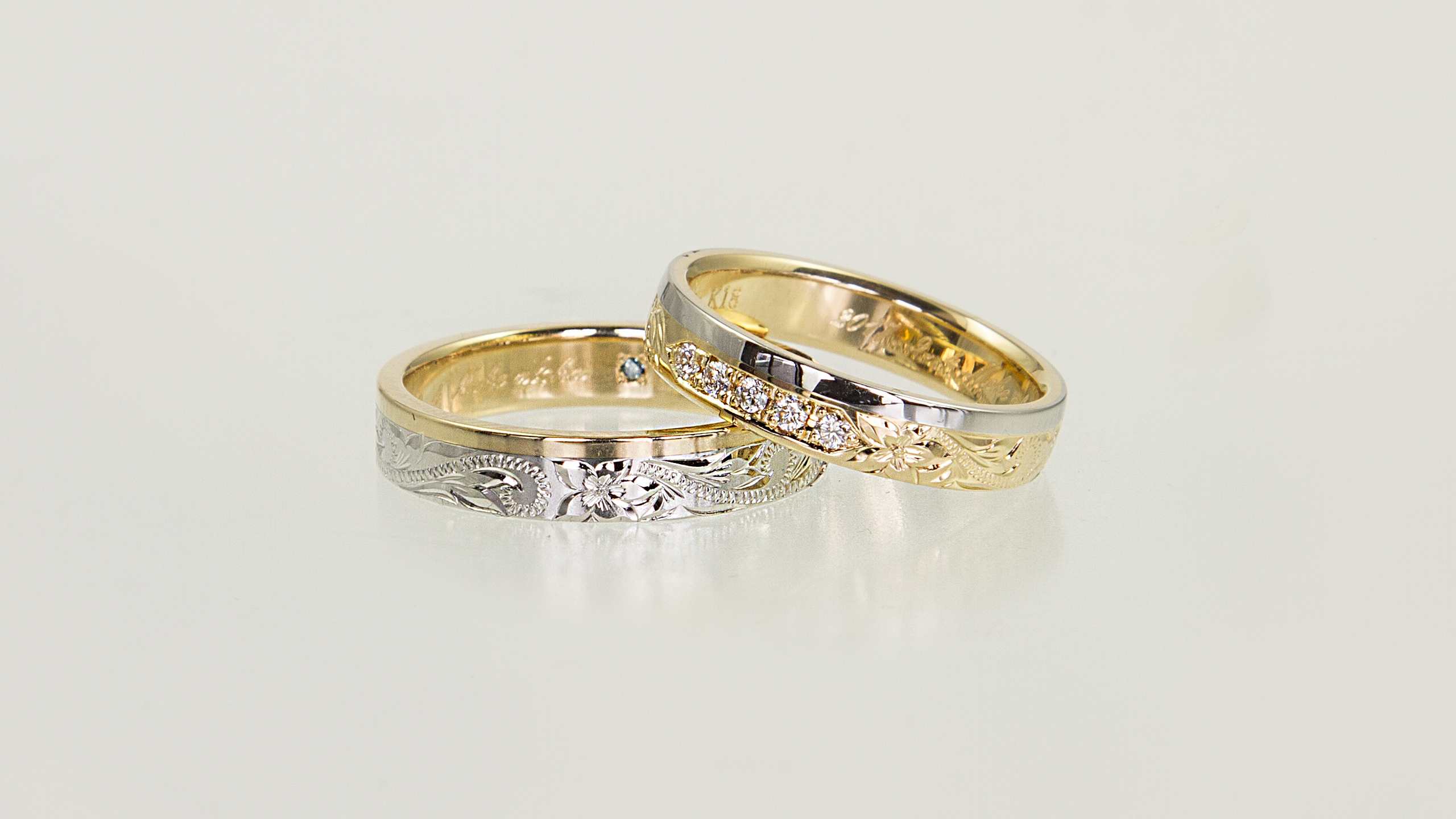 細かいオーダー1つ1つが形となって大満足。彫りがとても美しく感動した。私たちの希望どおりで、予算の範囲内でイメージぴったりのものを作って頂き、ほんとにありがとうございました。仕上りもきれいで、高品質で、大満足です。一生大切に身につけたいと思います。ありがとうございした。