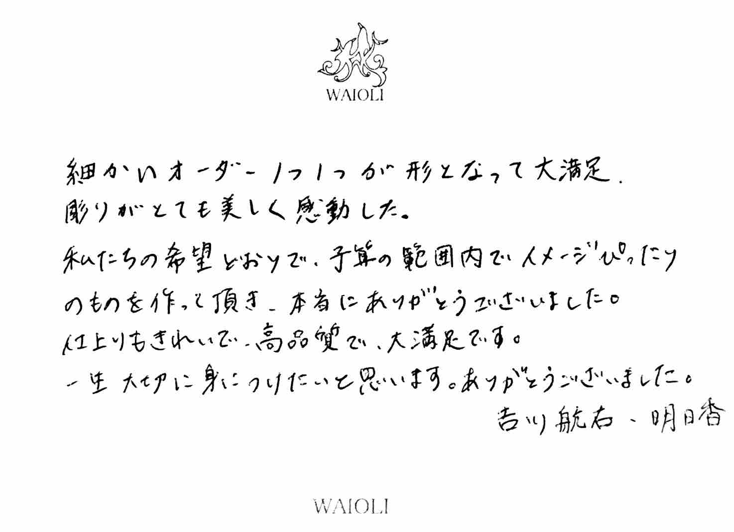 吉川様、この度はWAIOLIにオーダー頂き、誠にありがとうございました。 横に合わせるタイプのコンビリングの制作は初めてでしたが、信用してオーダー下さり、誠にありがとう御座いました。 私自身、完成した指輪を見た時はこんなにも綺麗なのか!と驚いてしまいました。(笑) 横合わせのコンビリングは私の自信作になりました。ありがとうございます。 お気に召して頂けて本当に嬉しいです。 メンテナンス等いつでもお気軽にお越しください。またお目に掛かれる日を楽しみにしております。