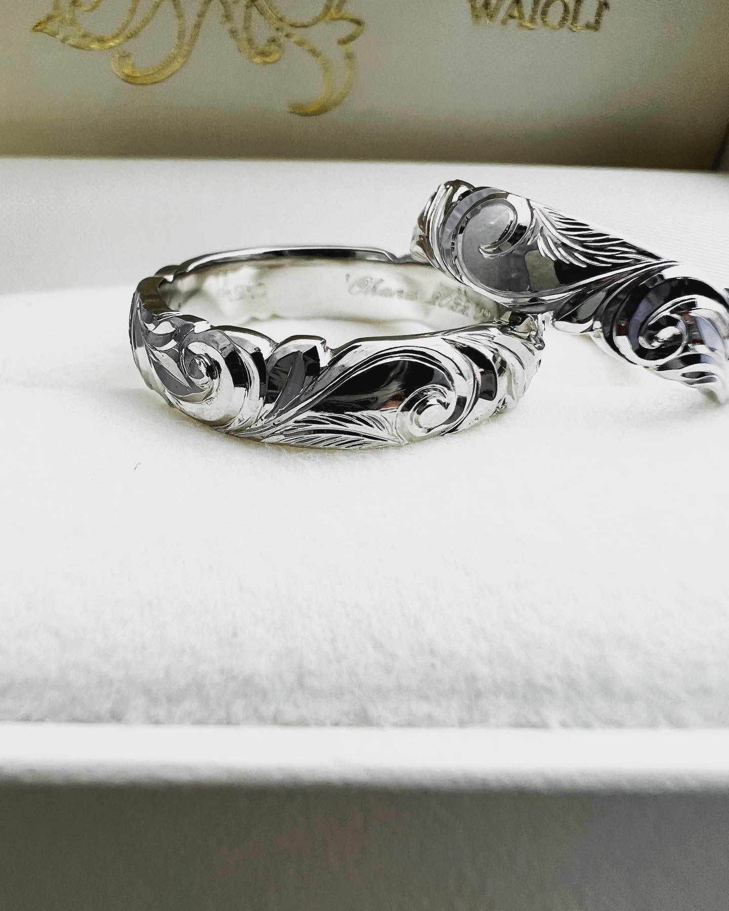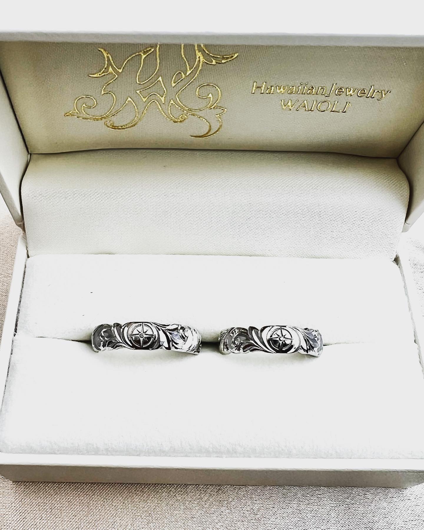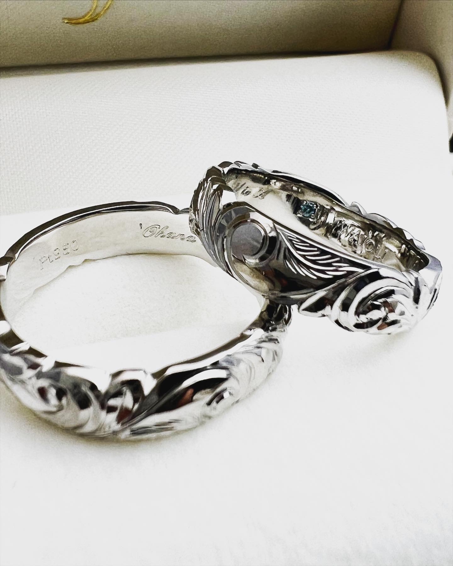 プラチナ950を使用したハワイアンジュエリーの御結婚指輪。羅針盤モチーフを中心にディープカットスクロールを手彫りしました。スクロールの1部分をお客様のお好きな羽モチーフに変更し、おふたりだけのハワイアンリングを制作させて頂きました。 当店は実際に制作させて頂く職人がお打ち合わせをさせて頂きつつ、目の前でデザインをご提案させて頂きますので、他には無い世界に1つだけのハワイアンリングをお作り頂けます。