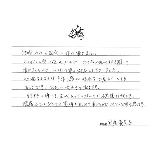 結婚25年の記念に作って頂きました。たくさんの想い込めたのでたくさん我がままを聞いて頂きましたが、いつも丁寧に対応して下さいました。心温まるような手作り感が伝わる工房がとてもすてきです。大切に使わせて頂きましす。キラキラに輝いて石が入っていないのに不思議な程です。模様ひとつひとつの意味を込めて頂いたので、パワーを頂いた感じです。