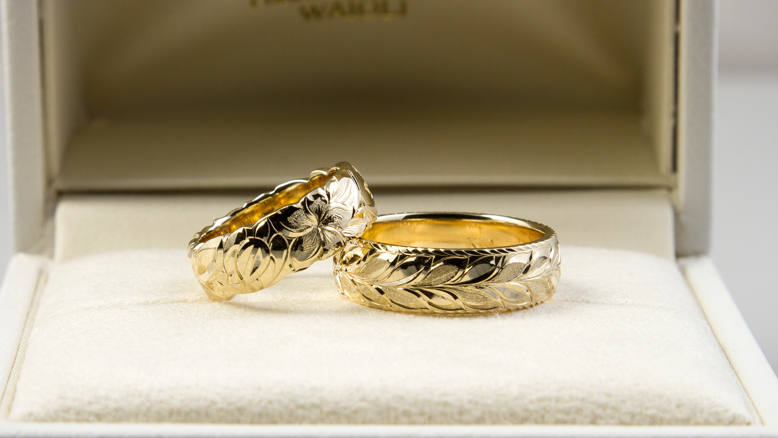ご結婚25周年のお祝いにオーダー頂きました。 長く続きますように。という意味が込められているマイレ模様に、プルメリアと幸せを運んでくると言われているホヌ(ウミガメ)を合わせました。模様が必ず1カ所は繋がっているように、というご要望を頂きましたので、マイレ・ホヌ・プルメリアのどこかを必ずつけ、途切れる事のない模様に致しました。お二人だけの模様が刻まれた指輪にとてもお喜び頂けました。
