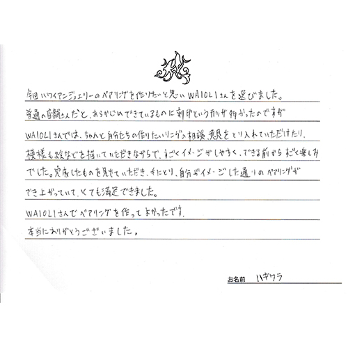 今回ハワイアンジュエリーのペアリングを作りたいと思いWAIOLIさんを選びました。普通の店舗さんだと、あらかじめできているものに刻印という形が多かったのですがWAIOLIさんではちゃんと自分たちの作りたいリングの相談、意見をとり入れていただけたり、模様も絵などを描いていただきながらで、すごくイメージがしやすくできる前からすごく楽しみでした。完成したものを見せていただき手にとり、自分がイメージした通りのペアリングができ上っていて、とても満足できました。WAIOLIさんでペアリングを作ってよかったです。本当にありがとうございました。