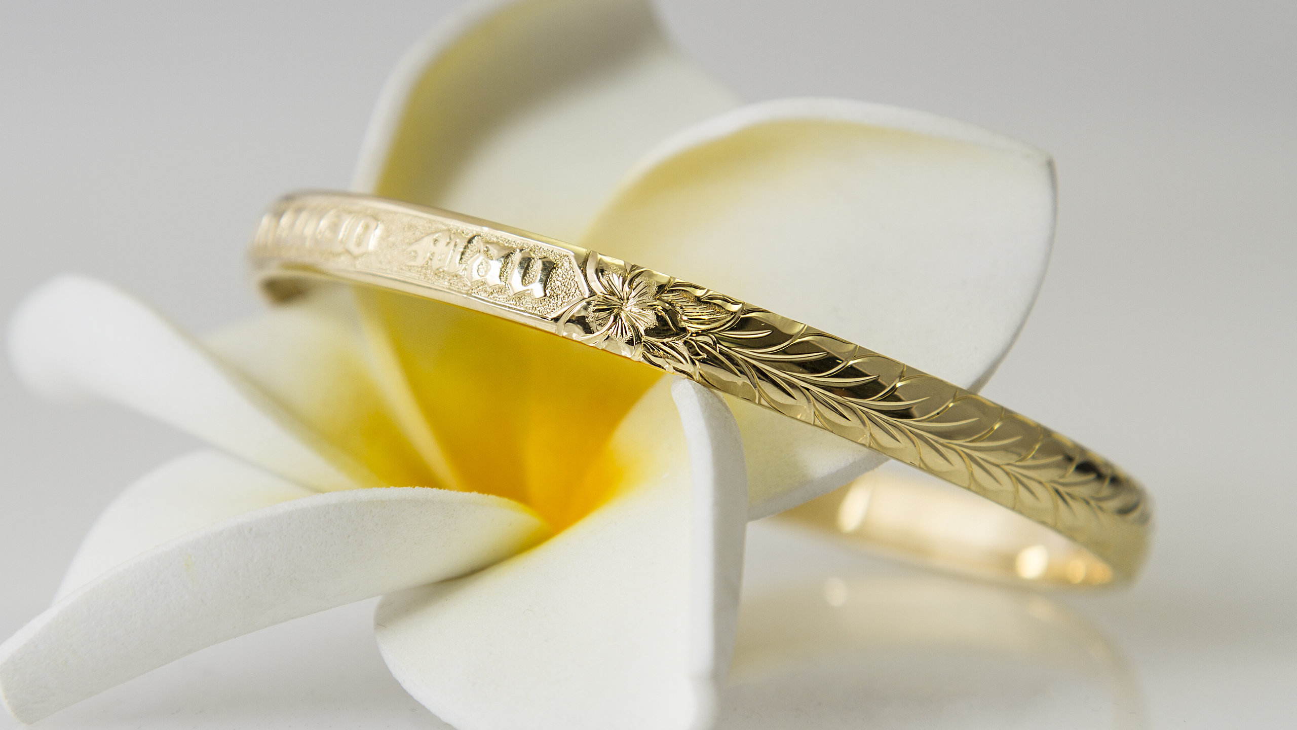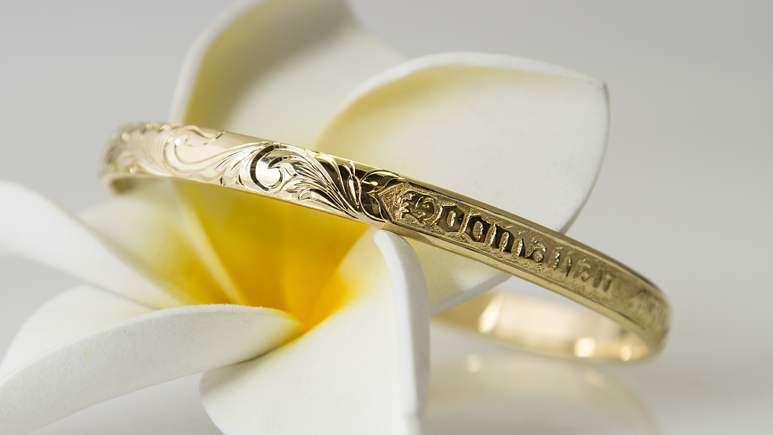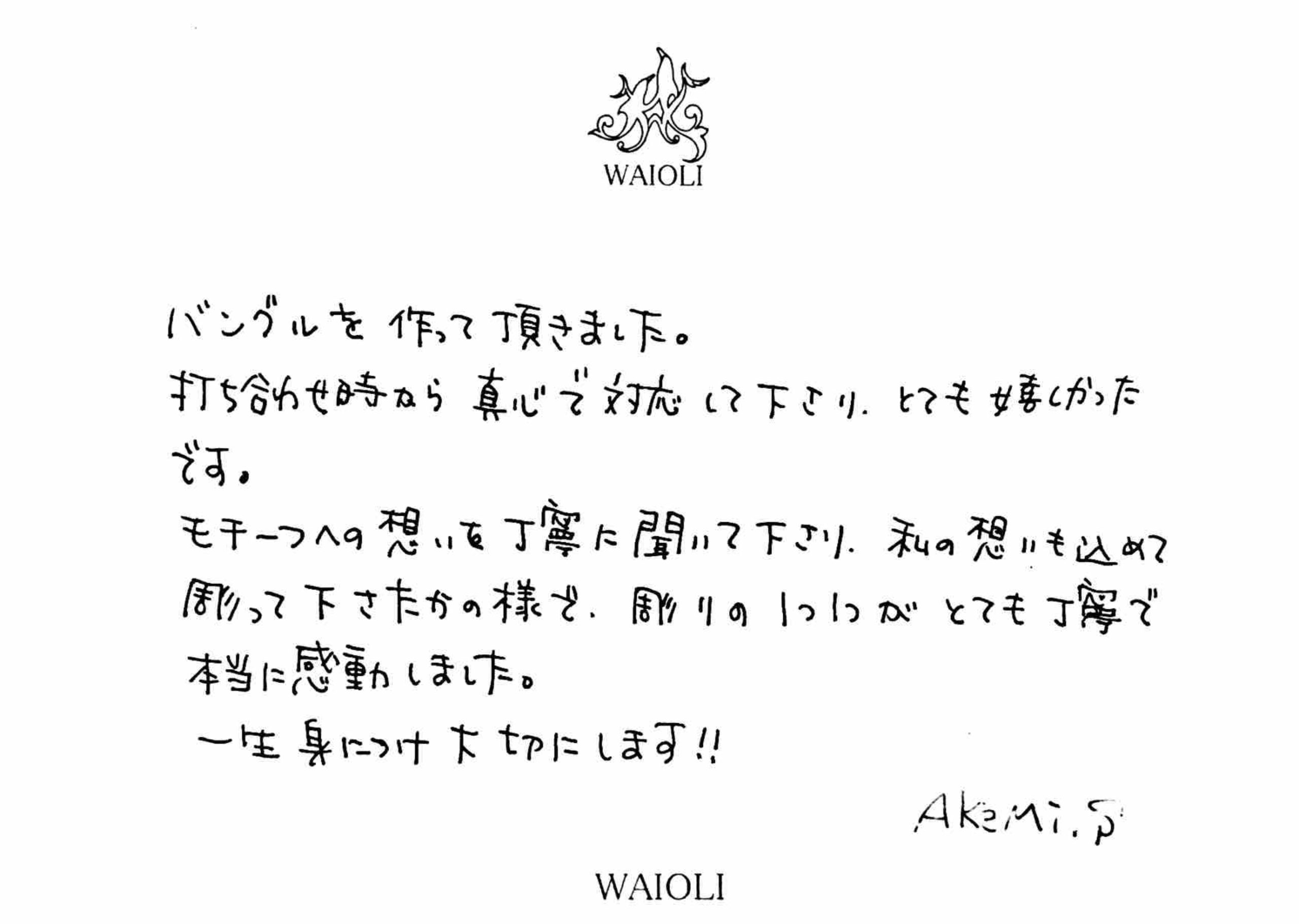 白田様、この度はWAIOLIにオーダー頂き、誠にありがとうございました。 大切な想いを込めたハワイアンバングルを作らせて頂き、心より感謝申し上げます。白田様の想いをお聞きし、デザインを一緒に作り上げていきました。 完成し、お渡しの際にはその想いを話しつつ2人して泣いてしまった事を覚えております。 模様は、文字の横に蝶とプルメリアを手彫りし、そこからスクロール&リーフが始まっております。蝶側のスクロール&リーフの1つを、幸せを釣り上げるといわれているフィッシュフック(釣り針)にアレンジし、途中からマイレモチーフに切り替わるようにデザインしました。 メンテナンス等いつでもお気軽にお越しください。またお目に掛かれる日を楽しみにしております。