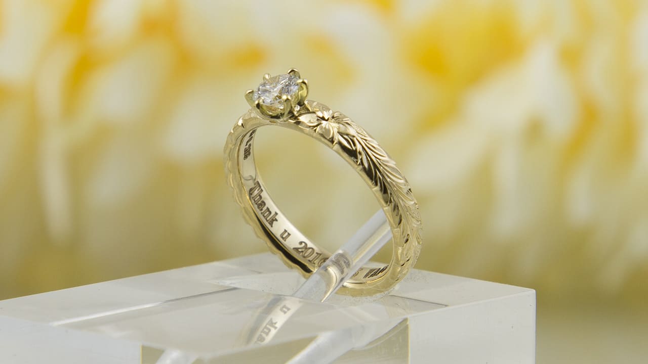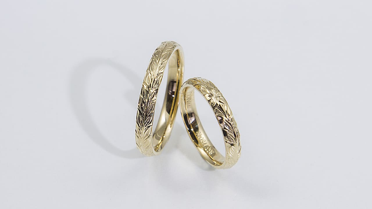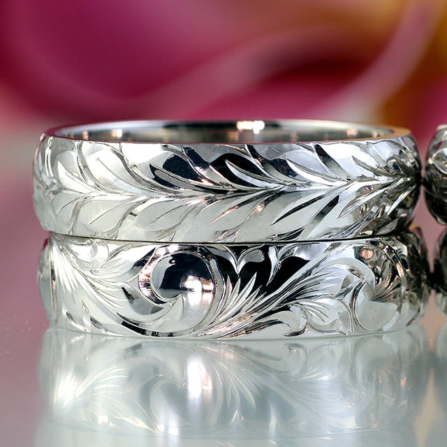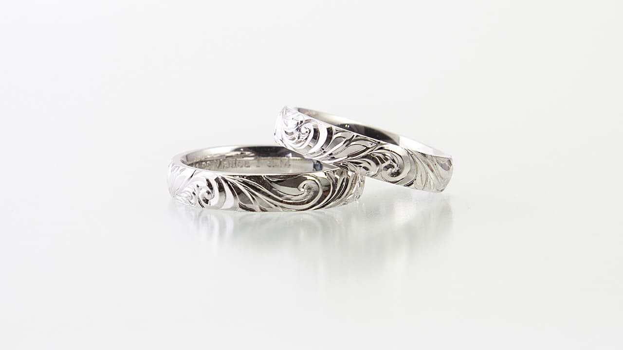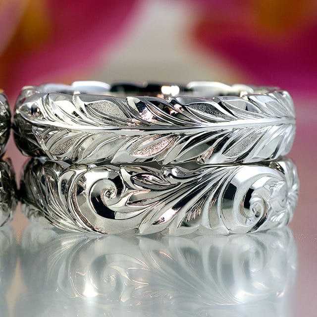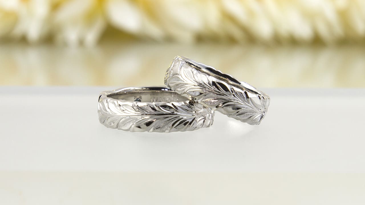 上の指輪がマイレモチーフ、下の指輪がスクロールモチーフになりますが、立体感に大きな違いがあるのが分かります。